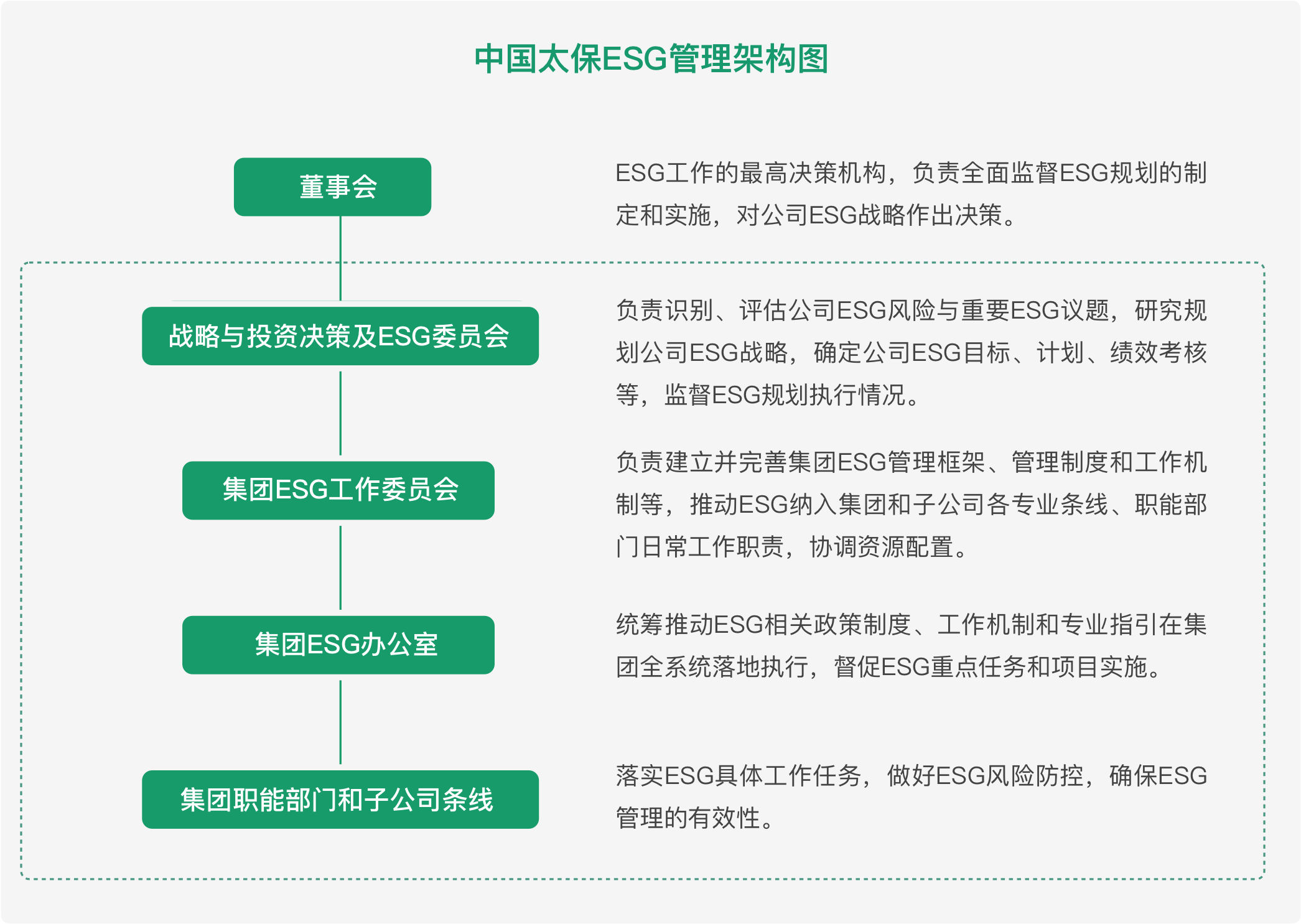 中國太保建立了層次分明、分工明確的“董事會(huì)-管理層-執(zhí)行層”的完整ESG治理架構(gòu),為集團(tuán)自上而下履行ESG實(shí)踐提供了良好的管理基礎(chǔ)和組織保障。中國太保董事會(huì)執(zhí)行董事和管理層的績效薪酬與ESG指標(biāo)表現(xiàn)相掛鉤。