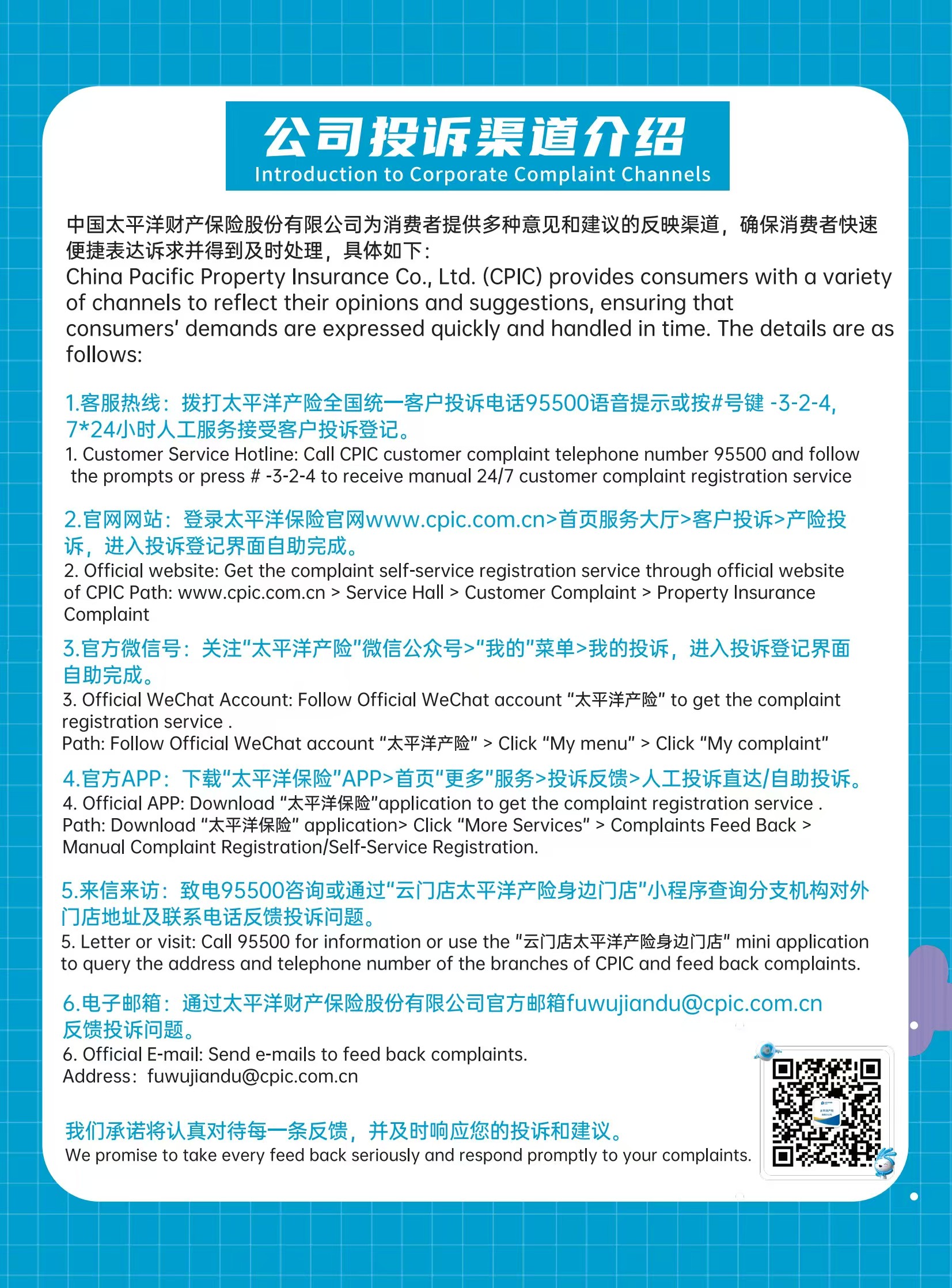 信函及接待地址、傳真號(hào)碼、電子郵箱等投訴渠道,請(qǐng)關(guān)注各省級(jí)分公司及分支機(jī)構(gòu)