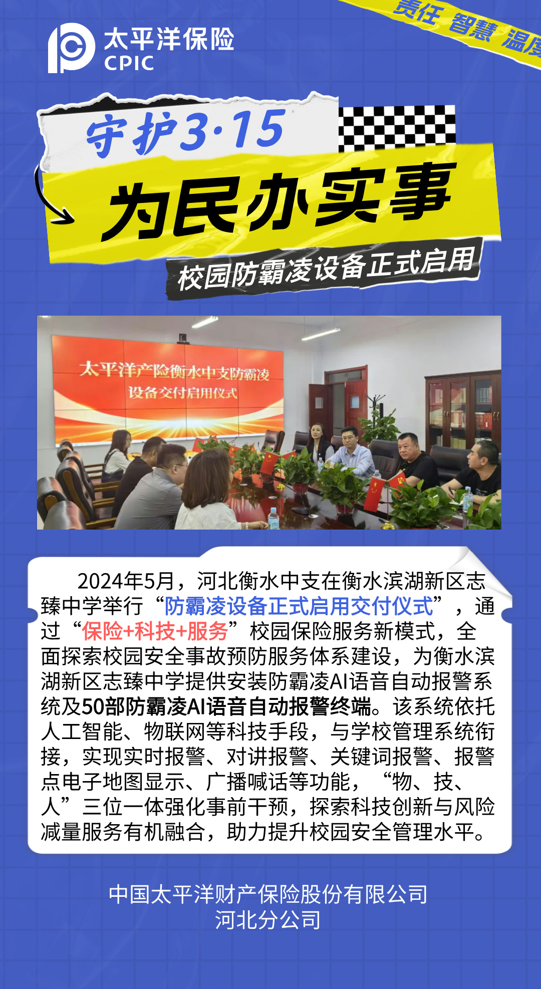 中國太保產(chǎn)險(xiǎn)河北分公司為民辦實(shí)事之校園防霸陵設(shè)備正式啟用