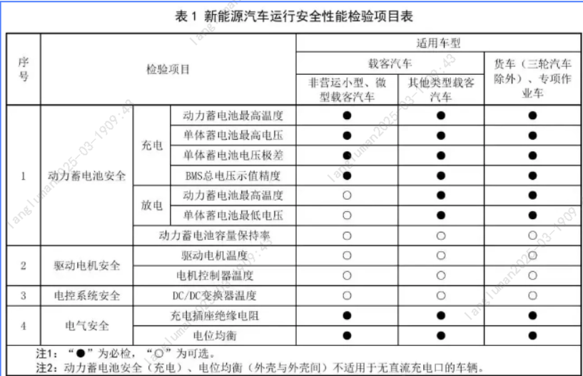 2025年3月1日起,《新能源汽車(chē)運(yùn)行安全性能檢驗(yàn)規(guī)程》正式實(shí)施,這是我國(guó)首部專(zhuān)門(mén)針對(duì)新能源車(chē)的安全檢測(cè)標(biāo)準(zhǔn),電池安全等納入年檢范圍!