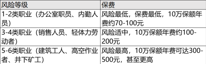 保險(xiǎn)公司將職業(yè)劃分為1-6類,風(fēng)險(xiǎn)等級越高,保費(fèi)越高。例如: